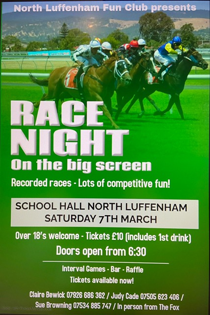 YES there is! The North Luffenham Fun Club is very pleased to announce the first North Luffenham fun event of 2026. The North Luffenham Race Night to be held in the School Hall on 7th March.