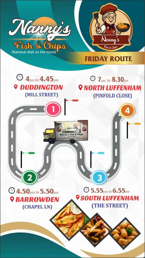 Nanny’s Fish and Chip van will be visiting North Luffenham every Friday, starting from tomorrow Friday 12th December.