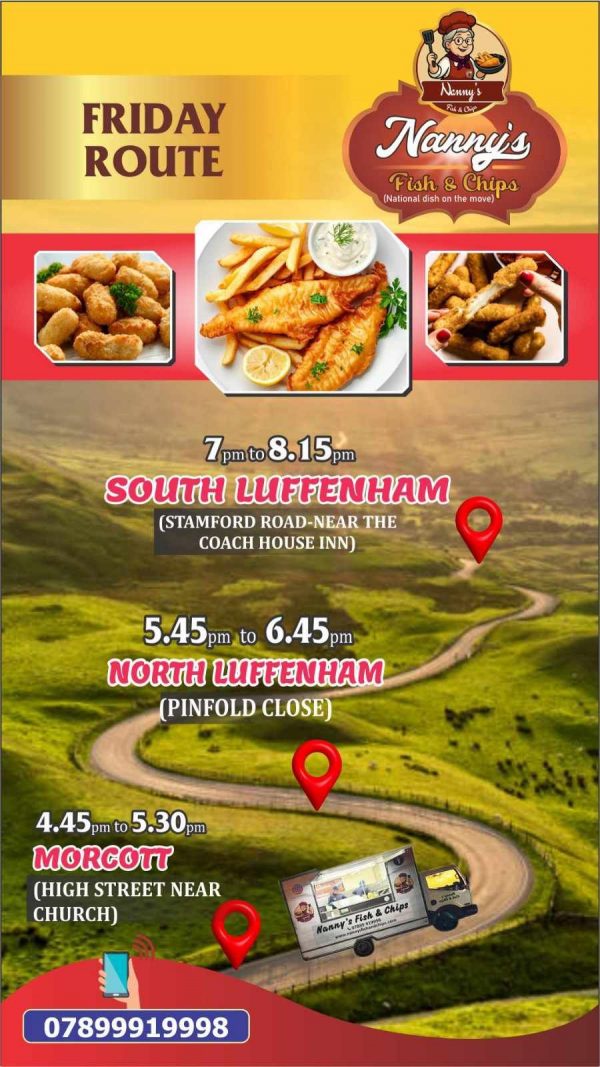 After a successful first visit to the village last week, Nanny’s Fish and Chip Van will be returning again this Friday. They will be on Pinfold Close between 5:45 and 6:45
